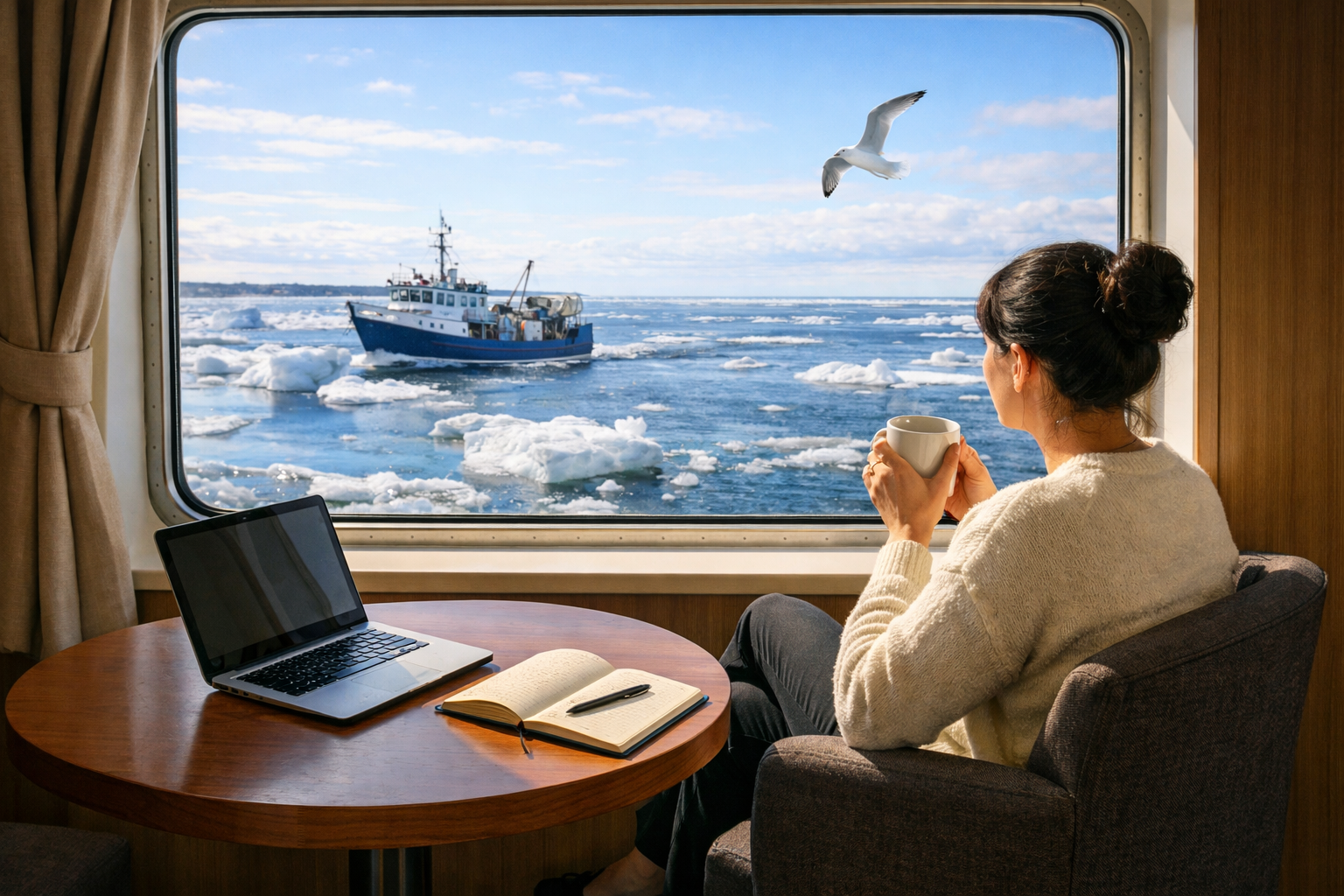Nii saigi soetatud edasi-tagasi laevapilet ja väike seiklus võis alata. Suureks üllatuseks oli päevasel ajal väljuv ja pisut enne südaööd naasev parvlaev suhteliselt inimtühi ja võimaldas seeläbi mõnusalt segamatut paaritunnist kulgemist. Esteetilist silmailu pakkusid suured jääkamakad avamerel, mööda triivivad väiksemad-suuremad laevad ja tuulega maadlevad kajakad.