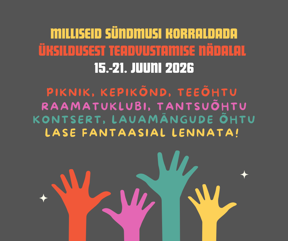 Kui teie seltskonnas on üks tubli korraldaja, siis andke märku! Toredaid inimesi ja positiivset algatust pole kunagi liiga palju. Pakume koos Üksildusest Teadvustamise Nädala raames sündmuseid, mis annavad võimaluse koos nii korraldamiseks kui ka osalemiseks.